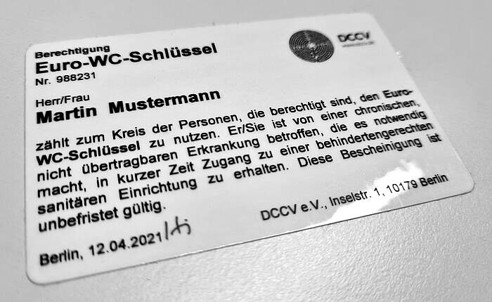 Hier hilft die Berechtigungskarte der DCCV, der Inhaber*innen legitimiert, den Namen, eine fortlaufende Nummer (nicht die Mitgliedsnummer) aber keine Diagnose enthält. Jedes Mitglied der DCCV kann diese Karte bekommen, eine kurze Mail an info(at)dccv.de mit der Bitte um Zusendung genügt. Wer die Karte bei langen Schlangen vor Toiletten vorzeigt, kann das Verständnis für das dringende Bedürfnis erhöhen und Diskussionen vermeiden.